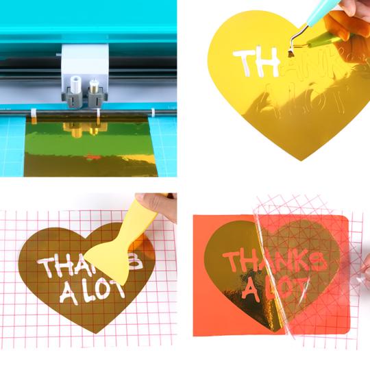 Wir empfehlen die Verwendung von Transferklebeband, um dein ausgeschnittenes Design nahtlos von der Originalunterlage auf deine Projektoberfläche zu übertragen.